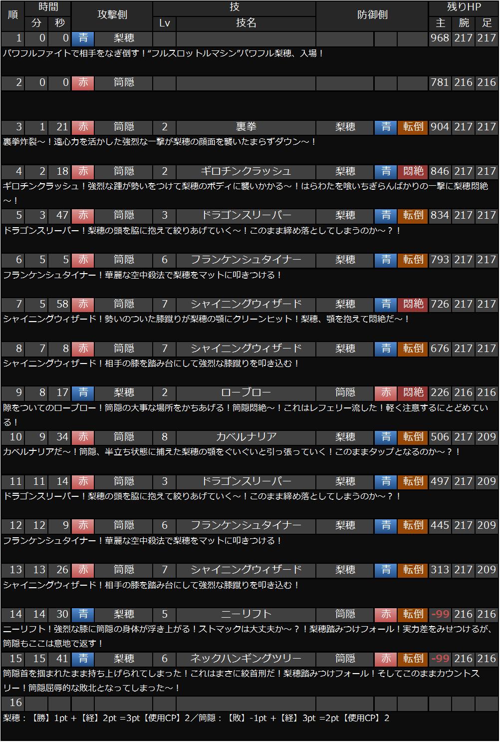 twes♥ : 【15分41秒 筒隠首を掴まれたまま持ち上げられてしまった!これはまさに絞首刑だ!梨穂踏みつけフォール!そしてこのままカウントスリー!筒隠屈辱的な敗北となってしまった〜!(青:梨穂:立ち/全:213/腕:217/足:209/必殺残:1/反則Lv:0/モチベLv:11)(赤:筒隠:転倒/全:-99/腕:216/足:216/必殺残:0/反則Lv:0/モチベLv:4)】梨穂:【勝】1pt +【経】2pt =3pt【使用CP】2/筒隠:【敗】-1pt +【経】3pt =2pt【使用CP】2 L9RFbiWcrNqO 2016/10/08 23:43